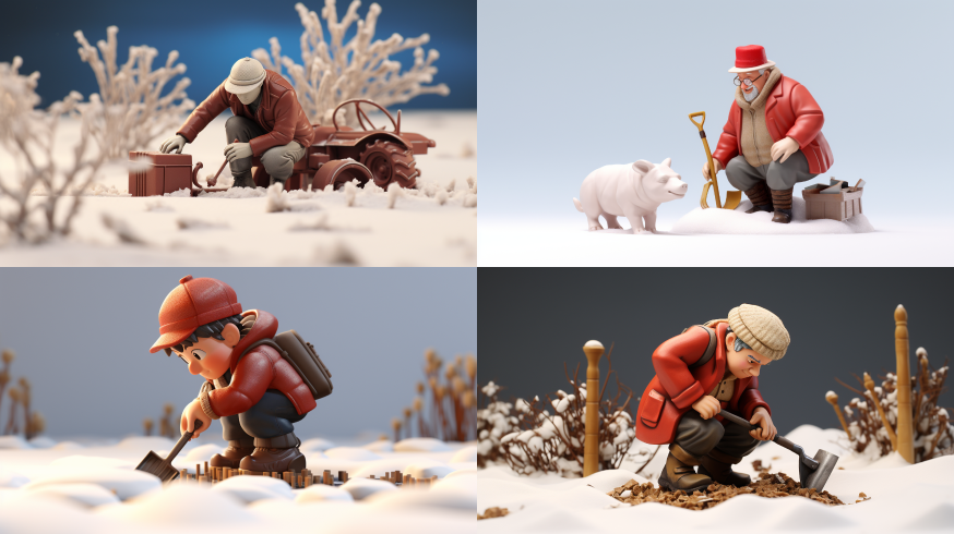 Midjourney Bot 更新时间:2023-08-29 14:51The farmer bent down to pick up something in the snow,3D model,Porco Rosso --ar 16:9 --style raw --v 5.2