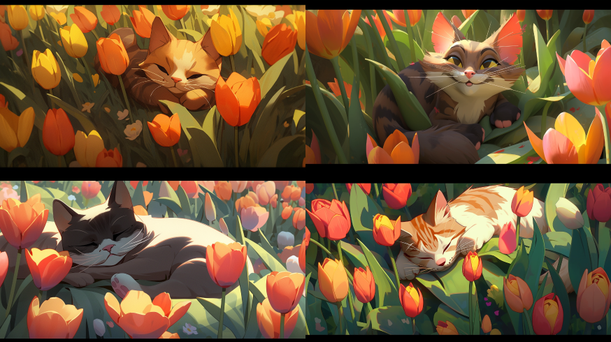 Midjourney Bot 更新时间:2023-08-29 14:49The cat lies in the tulip bushes --ar 16:9 --style expressive --niji 5