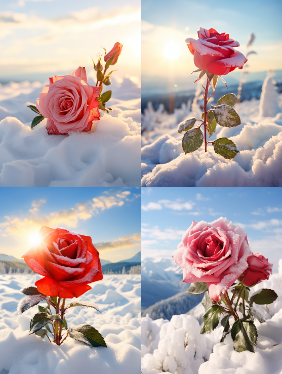 Midjourney Bot 更新时间:2023-08-29 14:54A rose in the icy and snowy landscape, snowflakes flying in the sky, roses covering the snow-covered mountains. A bunch of warm sunshine shines, creating a magnificent and breathtaking visual impact. Fresh color matching, romantic atmosphere. Photography, high definition, real, lifelike. --ar 3:4 --style raw --v 5.2