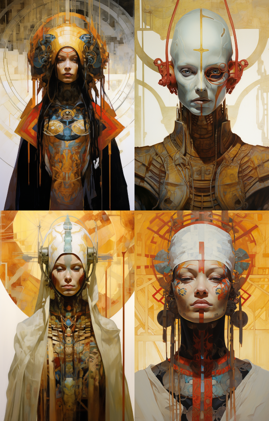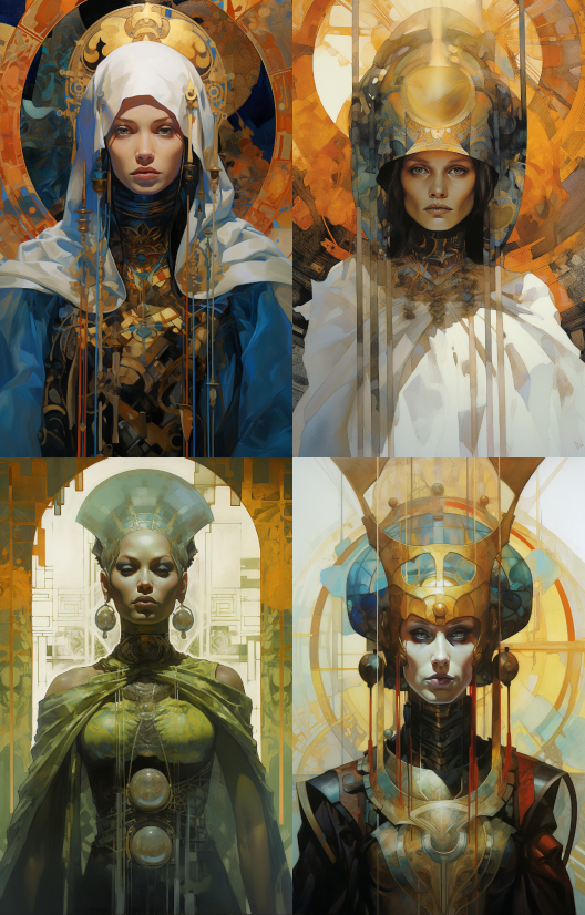 Midjourney Bot 更新时间:2023-08-29 14:17Portrait of an old republic external female centered empress from the aligned world of Amazonia, in the style of Vermeer, watercolor with bold ink outlines, Moebius, intensive interplay of light and shadows, bedded, Donato Giancola, Vincent van Gogh, scratched, velvet wealth, anthropological realism, dramatic layered composition,delicate skin texture,supermodel,Award-winning,Virgil Abloh,Milton H. Greene --ar 9:14 --style raw --v 5.2