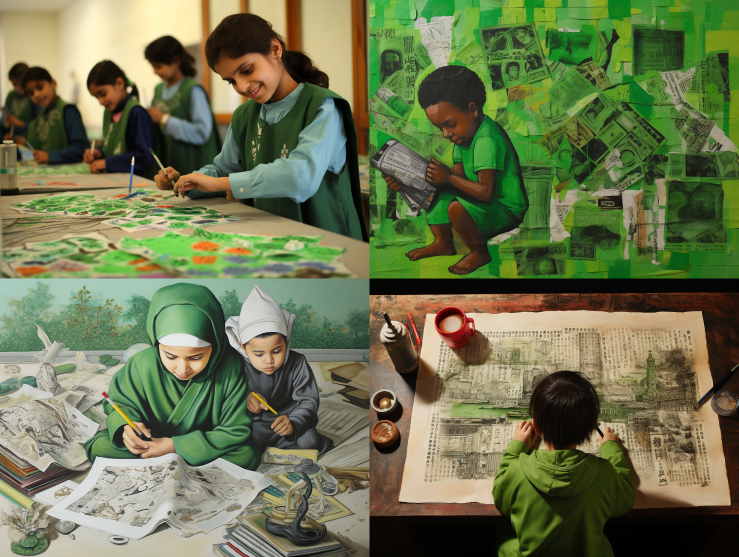 Midjourney Bot 更新时间:2023-08-29 14:16Creating calligraphy, painting, and handwritten newspapers around "green reading, civilized internet access", with a childlike heart to see the world, children's hand-painted green, showcasing the educational achievements of the "green bookmarks" activity in a colorful way, and showcasing the spiritual style of children in the new era --c 5 --ar 4:3 --v 5.2 --s 50