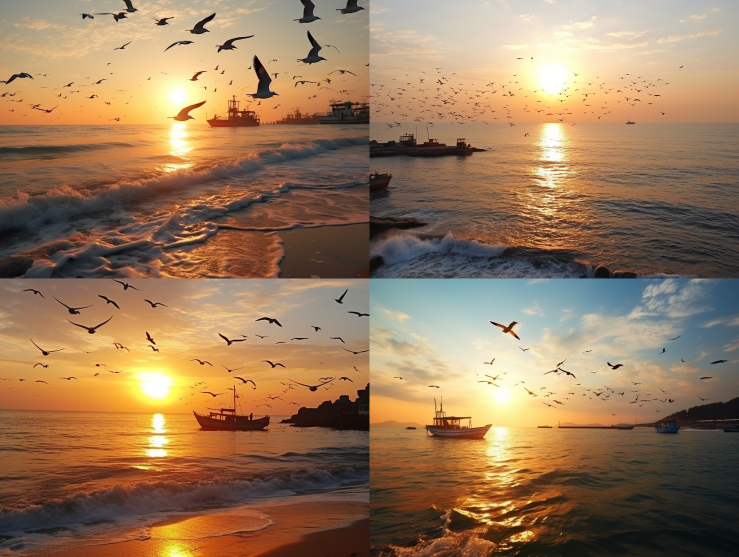 Midjourney Bot 更新时间:2023-08-29 14:17The sun rises from the sea level, birds fly in the sky, fishing boats travel in the sea, the sunlight shines on the water surface, and the waves push towards the beach. --ar 4:3 --style raw --v 5.2 --s 50