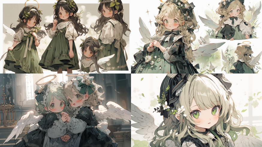 Midjourney Bot 更新时间:2023-08-29 13:31A little girl, angel halo, wings, bow headband, delicate overall dress, Western-style dress, dark green overall dress, pinafore dress, doll, doll collar, cute face, cute style, gothic fairy tale style, adorable, cute, avatar, watercolor texture, maid headdress. --s 201 --ar 16:9 --niji 5