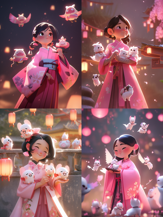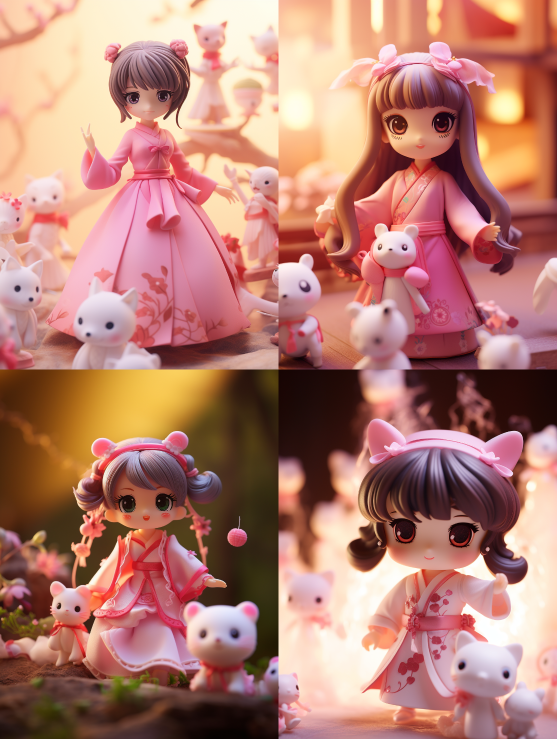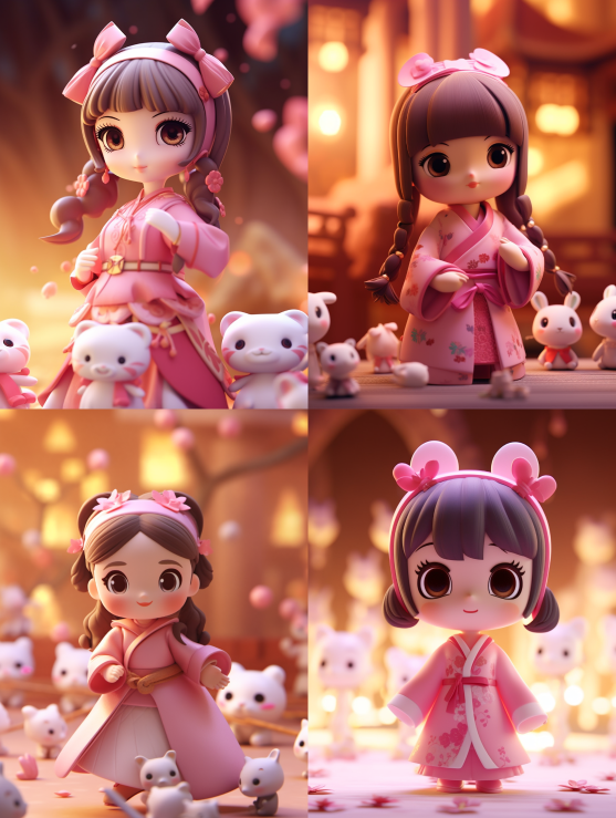Midjourney Bot 更新时间:2023-08-29 13:24A girl in a bright pink hanfu, with soft pink pets flashing around her in the wind, looking at the camera, smoothing soft, eyes sparking, pink and white papers, soft lighting, IP, Blind Box, mini figures, toys, 3D, C4D, OC render, Super cut little girl, Clay texture, Bokeh, bright, Chest shot, Clay texture, Bokeh, bright, Chest shot Clay text ure, Bokeh, bright, wait shot --seed 1309946 --ar 3:4 --style scenic --niji 5 --s 50