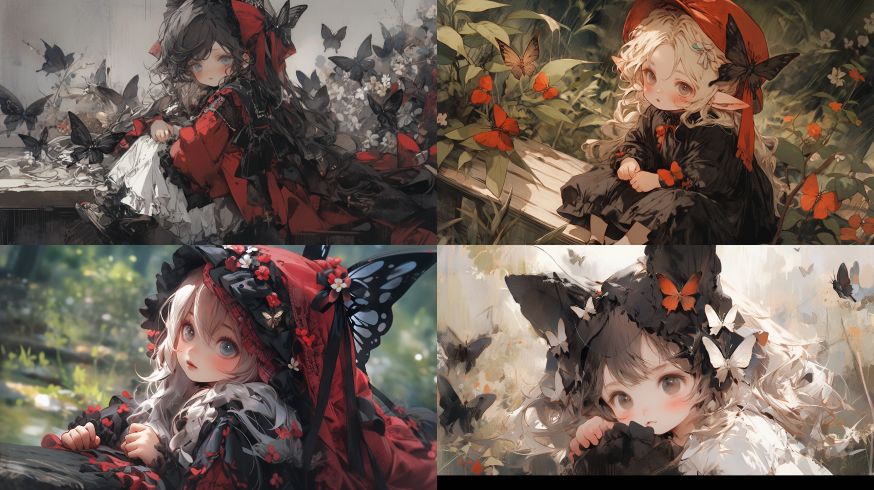 Midjourney Bot 更新时间:2023-08-29 13:30A 2-year-old little girl, black bow, delicate doll dress, Western-style dress, red doll dress, elf ears, black butterfly, doll collar, cute face, cute style, gothic fairy tale style, adorable, cute, avatar, sitting, watercolor texture. --s 203 --ar 16:9 --niji 5