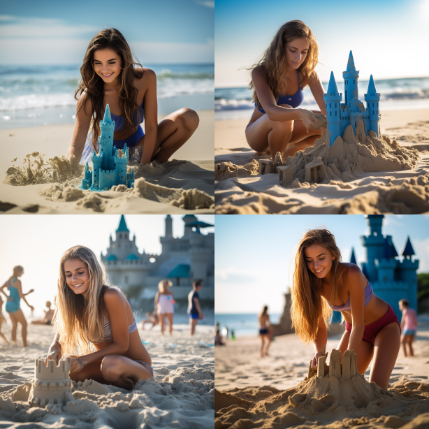 Midjourney Bot 更新时间:2023-08-29 13:34Masterpiece, 8K, an 18-year-old girl wearing a blue swimsuit, building sandcastles at the beach. --ar 1:1 --style raw --v 5.2