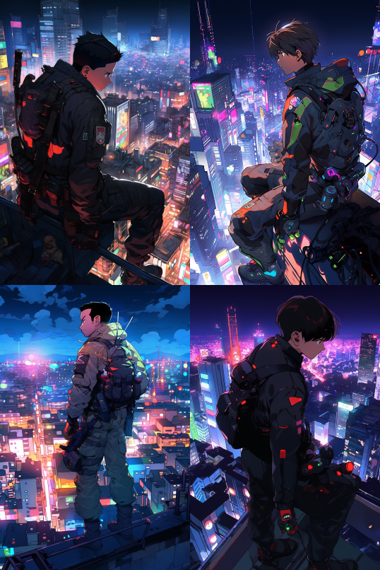 Midjourney Bot 更新时间:2023-08-29 13:32Japanese anime style, a young male soldier, crew cut ,wearing combat suit,perches on a neon-lit rooftop overlooking a sprawling metropolis, vivid colors. --ar 2:3 --niji 5