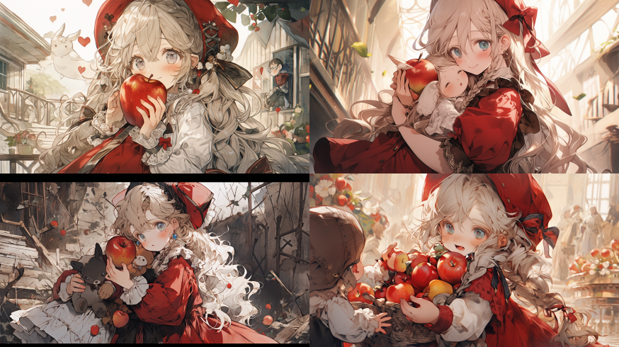 Midjourney Bot 更新时间:2023-08-29 13:23A little girl holding a red apple, broken glass, castle, indoor, bow headband, delicate overall dress, Western-style dress, red doll dress, pinafore dress, doll, doll collar, cute face, cute style, gothic fairy tale style, adorable, cute, avatar, watercolor texture. --s 199 --ar 16:9 --niji 5