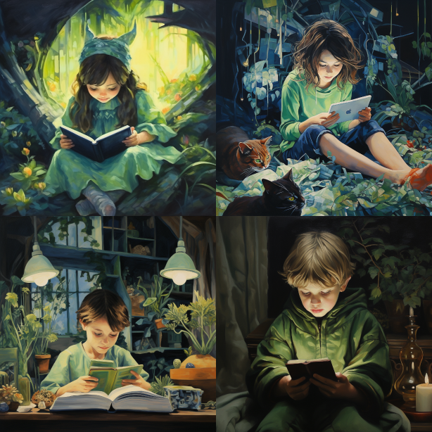 Midjourney Bot 更新时间:2023-08-29 13:30Green Reading, Civilized Online Children's Painting --ar 1:1 --style raw --v 5.2