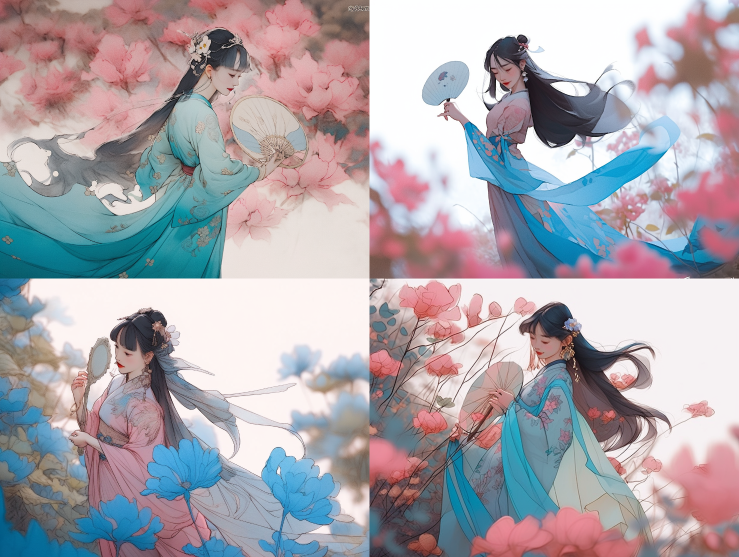 Midjourney Bot 更新时间:2023-08-29 09:32Ancient Chinese woman, fairy sister, exquisitely portrayed, with flying hair, flowing skirt, wide sleeves, blue color, and lush flowers,Watercolour --s 180 --ar 4:3 --style expressive --niji 5