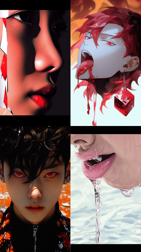 Midjourney Bot 更新时间:2023-08-29 09:16closeup Summer editorial, dadaist poster, exaggerated realism, romantic realism, shiny lips, pale red and pale gray, large shiny eyes, kiss me, larme kei, reinterpreted human form, deconstruction, man rey, cryptid academia, modern realism, digital illustration --ar 51:91 --c 100 --s 1000 --niji 5