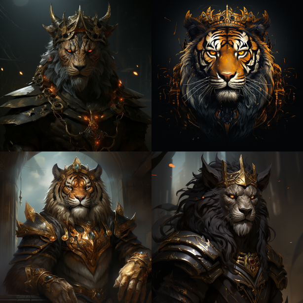 Midjourney Bot 更新时间:2023-08-29 08:58Tiger, crown, Grimdark --s 310 --c 21 --ar 1:1 --style raw --v 5.2