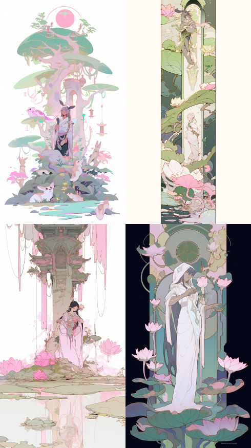 Midjourney Bot 更新时间:2023-08-29 09:09Art in the style of Ancient Japanese aesthetics, colored India Ink, zen symbols, light colors, light pink, white, light green, many details --s 180 --ar 9:16 --style expressive --niji 5