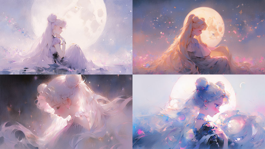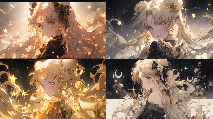 Midjourney Bot 更新时间:2023-08-29 08:50The sailor moon in the dark, the starry sky, the twinkling stars, the sailor moon, Front angle, Pastel: 2, sailor moon, Starry, hair rib, yellow and black tone ,Enchanted garden --ar 16:9 --niji 5