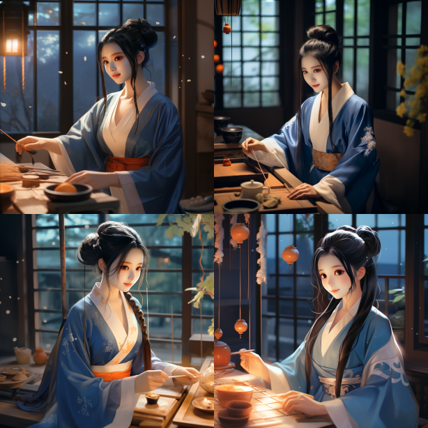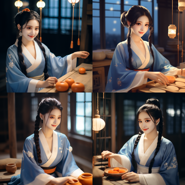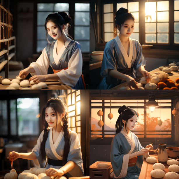 Midjourney Bot 更新时间:2023-08-29 07:30She is kneading dough to make steamed buns, wearing a blue Hanfu dress, with two big braids on her head, a smile on her face, sweat on her forehead, and the sunrise outside the window. --iw 1.5 --ar 1:1 --style raw --v 5.2