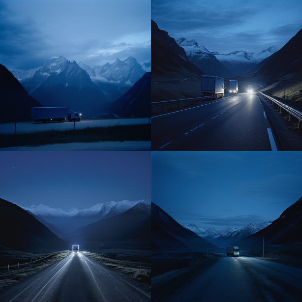 Midjourney Bot 更新时间:2023-08-29 07:37a mountain mountain ranges in the distance as two trucks pass by, in the style of daan roosegaarde, rinko kawauchi, peter zumthor, dark cyan and light bronze, intense and dramatic lighting, leica r8, luminescent color scheme --ar 1:1 --style raw --v 5.2