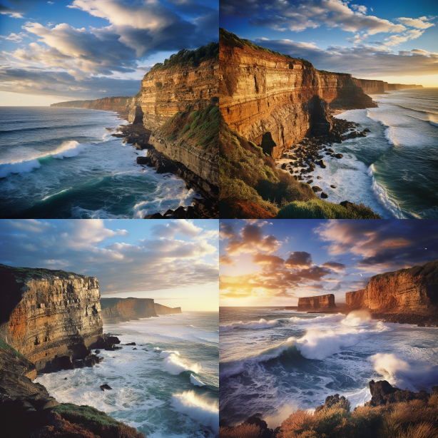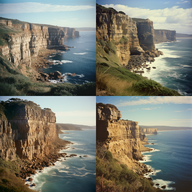 Midjourney Bot 更新时间:2023-08-29 07:24tall cliffs overlooking the ocean, in the style of tokina opera 50mm f/1.4 ff, edward lear, australian landscapes, photo taken with ektachrome, frank gehry, 32k uhd, indigo and beige, sunrise, colorful clouds. --ar 1:1 --style raw --v 5.2 --s 750