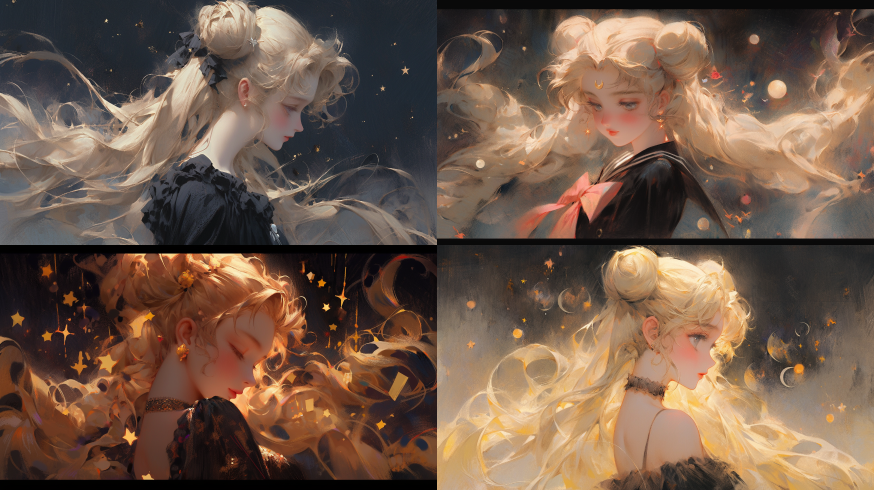 Midjourney Bot 更新时间:2023-08-29 08:36The sailor moon in the dark, the starry sky, the twinkling stars, the sailor moon, oil painting texture, Pastel: 2, Sailor Moon, Starry, hair ribbon ,yellow and black tone --ar 16:9 --niji 5