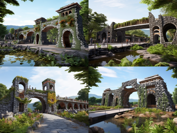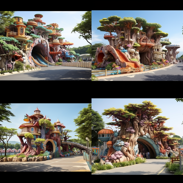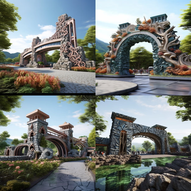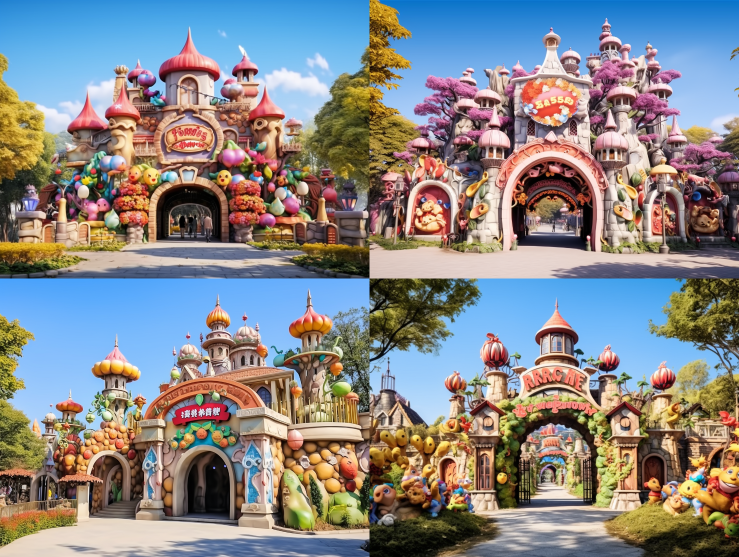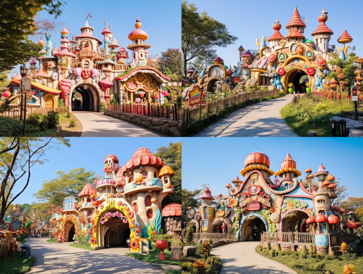 Midjourney Bot 更新时间:2023-08-29 00:04The entrance of the Ecological Fairy Tale Kingdom Park is grand, dreamy, and colorful --c 10 --iw 1.5 --ar 4:3 --style raw --v 5.2 --s 750