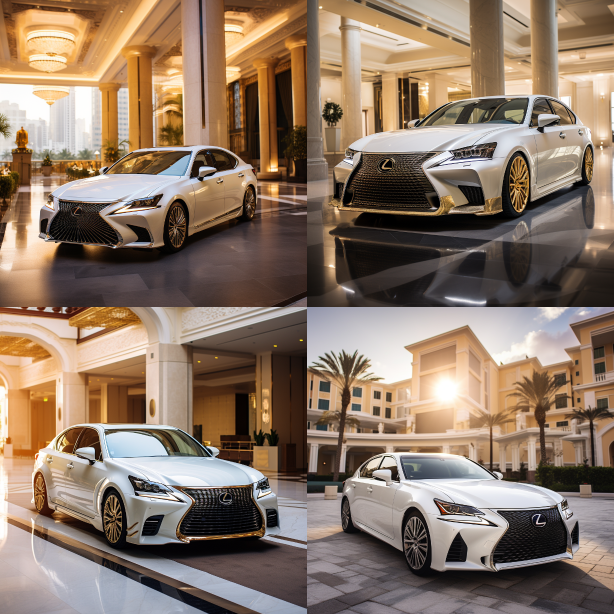 Midjourney Bot 更新时间:2023-08-28 23:47Masterpiece, high quality, 16k, Lexus GS, white with gold trim, in a high-end hotel, Direct Sunlight, Direct Sunlight. --ar 1:1 --style raw --v 5.2
