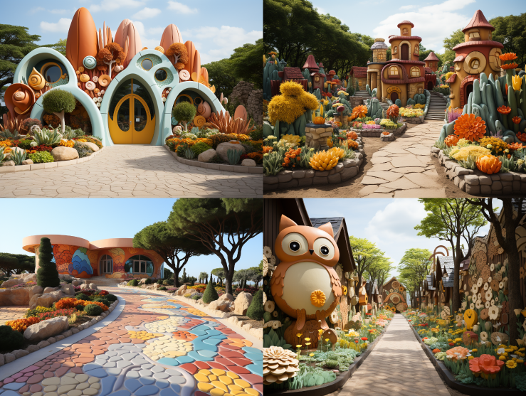 Midjourney Bot 更新时间:2023-08-28 23:47Green plants, stones, cartoon animals, and colorful colors at the entrance of the Ecological Children's Kingdom --c 7 --ar 4:3 --style raw --v 5.2 --s 750