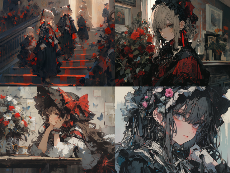 Midjourney Bot 更新时间:2023-08-29 00:07Gothic style dark girl illustration, summarization, red and black tone,red and black tone,Dream colors,low saturation,maid headdress::2,oil painting::2 --ar 4:3 --niji 5 --s 750