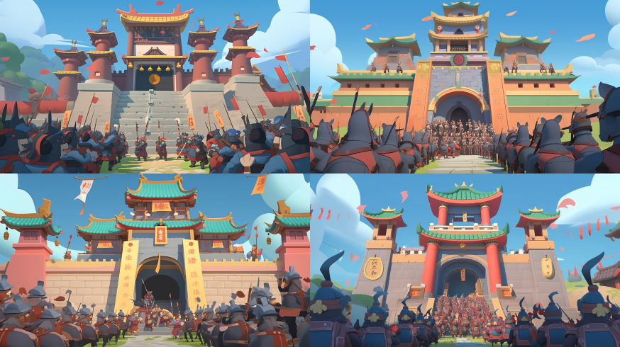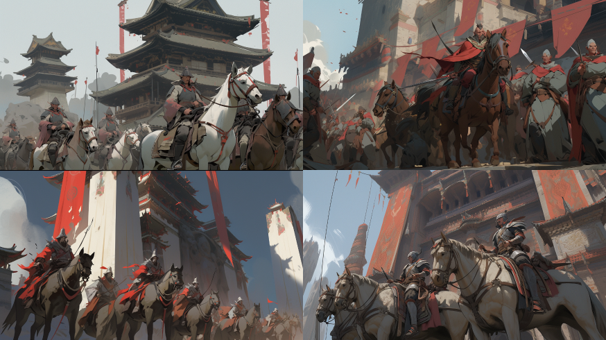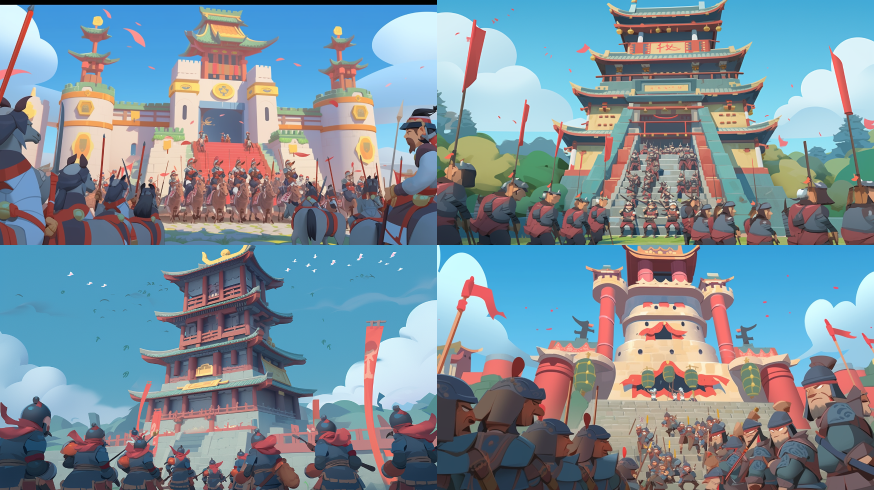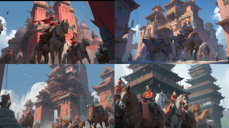 Midjourney Bot 更新时间:2023-08-28 21:35Soldiers surround the city tower, wearing armor, holding knots, horses, flags, Chinese style, 3D, Disney style, 3D animation, C4D --s 436 --ar 16:9 --style expressive --niji 5
