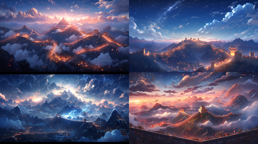 Midjourney Bot 更新时间:2023-08-28 21:40The Great Wall of Beijing, winding and winding with dragons and tigers, beacon towers, clouds, starry nights, bird's-eye view, ultra wide angle, panoramic view, night lighting, movie lighting, luminous substances, UHD, 8K --ar 16:9 --niji 5