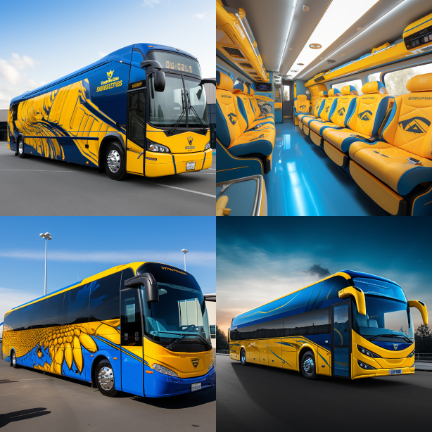 Midjourney Bot 更新时间:2023-08-28 21:52Design a football team bus with a main color tone of bright yellow and a secondary color of blue, giving it a sense of luxury. --ar 1:1 --v 5.2 --style raw