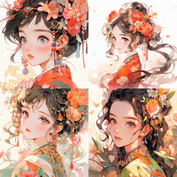 Midjourney Bot 更新时间:2023-08-28 21:47Graphic illustration, Chinese girl Hanfu, bright colors, floral patterns, close-up. --ar 1:1 --niji 5
