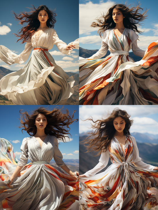 Midjourney Bot 更新时间:2023-08-28 21:28A model with colorful flowing long hair and white wings, dressed in a white long dress, dances in the mountains. It is a visual art, art photography, realistic style, captured with a vintage film camera, featuring multi-angle composition. The visuals are fashionable, minimalist, and sophisticated, with a cinematic feel and a 32k ultra-high-definition resolution. --ar 3:4 --style raw --v 5.2 --s 750