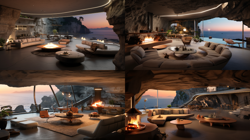 Midjourney Bot 更新时间:2023-08-28 19:49Wide shot of big Luxurious futurist living room and kitchen of concrete 3D printed house on top of the cliff, sunken fire pit, interior design awarded, modern led lights, detailed texture, view of a concrete 3D printed mid - century modern art design studio designed by Peter zummer, japadi style, sitting on a rocky cliff next to the ocean, no concrete trials, fufu Turkish, Bright near textured walls and architectural awarded design, design elements, pop art on walls, Modern graphic art studio space, and class brass marble steel, abstract art, warm light fixtures, cosy indirect warm light inside, sunny day, extremely detailed, integrated details, film photography by Julius Shulman --ar 16:9 --style raw --v 5.2