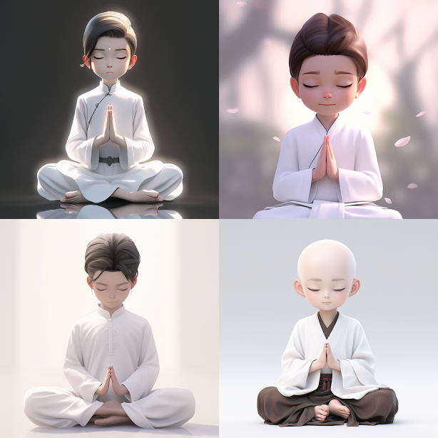 Midjourney Bot 更新时间:2023-08-28 19:34A 5-year old boy with a Chinese style, dressed in white, with long eyelashes, sitting cross raised on a large lotus flower, hands folder, solid pose, simple long hair, close-up, 3D, C4, white background, ultra detailed animation lighting, defocus, perfect details, FHD --ar 1:1 --niji 5 --s 750
