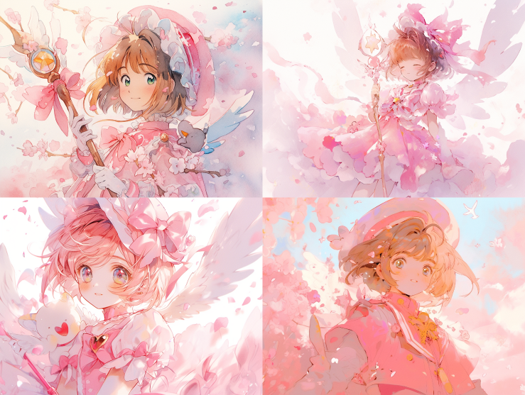 Midjourney Bot 更新时间:2023-08-28 19:36Kinomoto Sakura from Card Captor Sakura by clamp,Cute pink combat uniform,watercolor texture, oil painting texture,oil painting,Pastel::2 ,Dream colors ,Van Gogh color --ar 4:3 --niji 5