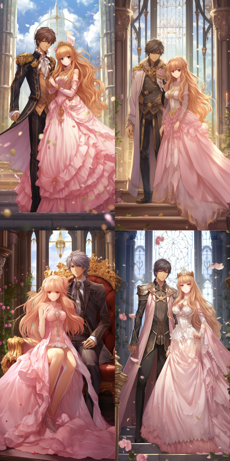 Midjourney Bot 更新时间:2023-08-28 19:34The princess and the prince are in the castle. The princess has long golden hair, pink earrings, a pink dress, crystal shoes, and makeup. The prince had brown hair and a golden crown, wore a black dress top, white pants, and boots,HDR,Angel Beats,Anime style --ar 1:2 --style raw --v 5.2
