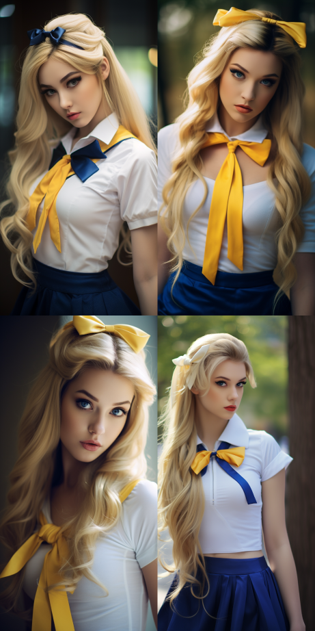 Midjourney Bot 更新时间:2023-08-28 19:19Beautiful girl with long yellow hair tied in two ponytails, white top with bow tie, blue skirt,delicate skin texture,Best quality,The World Ends With You,Sailor Moon,Campus --ar 1:2 --style raw --v 5.2