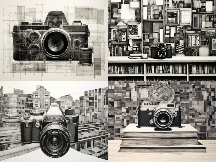 Midjourney Bot 更新时间:2023-08-28 18:27Leica camera,panorama,bokeh,Ultra Wide Angle,Photogram,Pencil drawing,Linocut print,Grayscale,geometric,library background --ar 4:3 --style raw --v 5.2
