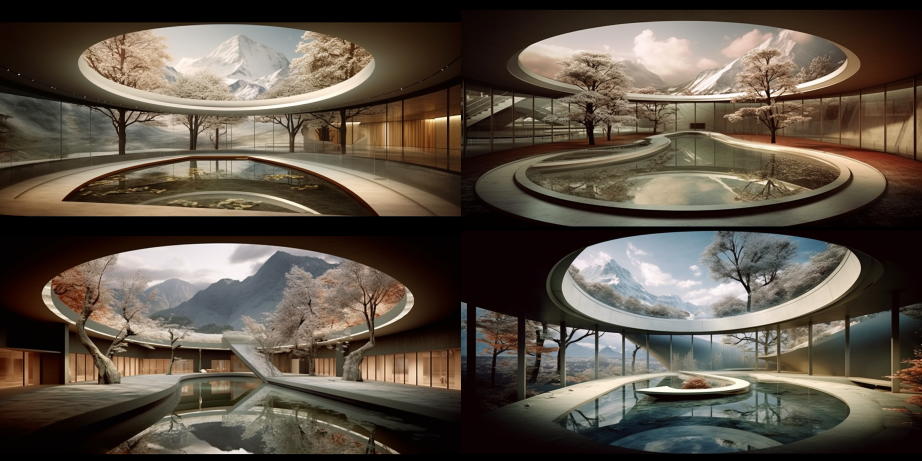 Midjourney Bot 更新时间:2023-08-28 18:31The Classic of Mountains and Rivers themed exhibition hall, architectural rendering, architectural lighting, UHD --ar 2:1 --style raw --v 5.2
