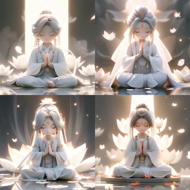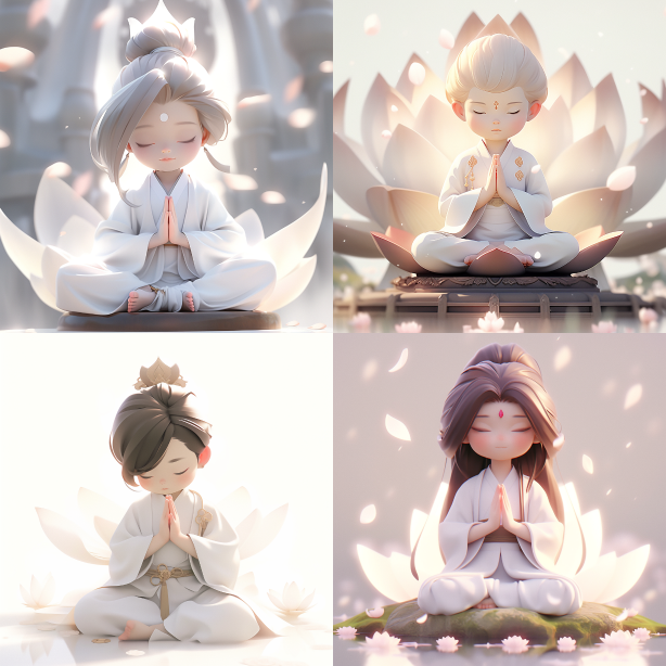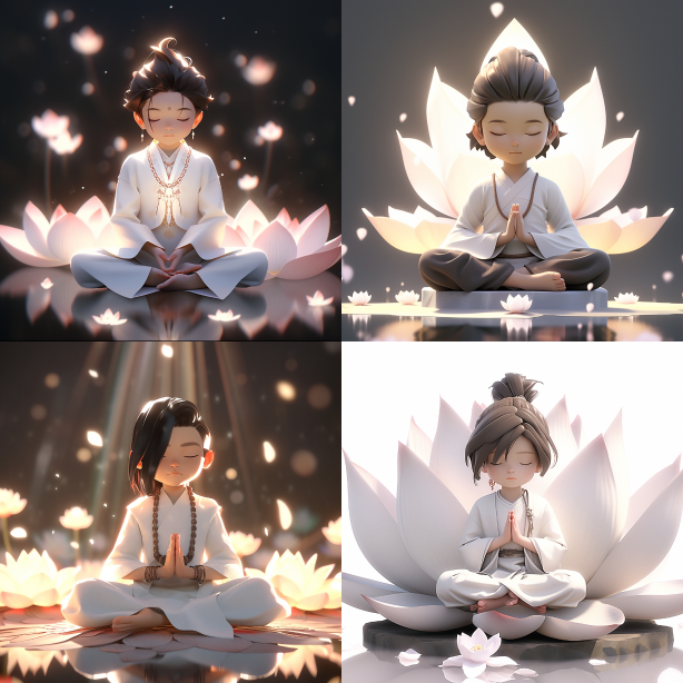 Midjourney Bot 更新时间:2023-08-28 18:28A 5-year old boy with a Chinese style, dressed in white, eyes closed, sitting cross raised on a large lotus, hands praying, solid pose, simple long hair, 3D, C4, white background, ultra detailed animation lighting, defocus, perfect details, FHD --s 110 --ar 1:1 --niji 5