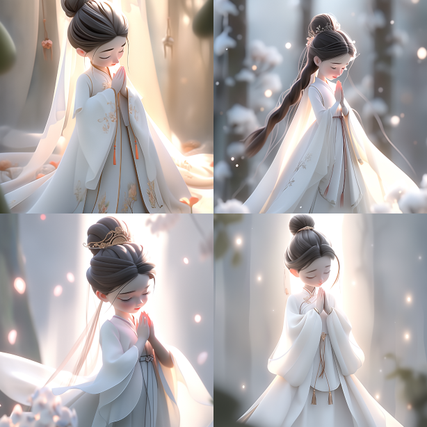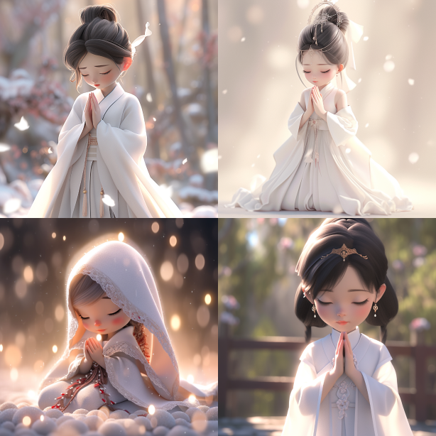 Midjourney Bot 更新时间:2023-08-28 18:35Chinese style,cute gir praying,in a white cloth in aeligious pose on the ground,in the style of lightwhite and light silver, childlike simplicity, classicainspiration,meticulous design,3d,c4d, Hyperdetailed,animation lighting,bokeh,perfectdetails,FHD,4K,8K --ar 1:1 --niji 5