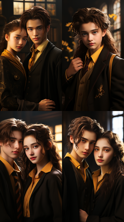 Midjourney Bot 更新时间:2023-08-28 18:33The boy is a bit more handsome, about four centimeters taller. The boy is Cedrick Diggory from Hogwarts, and the girl is a 16 year old beauty of mixed Chinese and English ancestry. Her hair is straight and black --ar 9:16 --style raw --v 5.2 --s 750