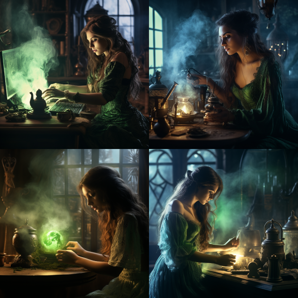 Midjourney Bot 更新时间:2023-08-28 18:23A beautiful switch in her alchemist room, working on her project with a steaming cauldron filled with green glowing smoke, resist the backdrop of a fantasy night with a full moon and a view from the window, dressed in a traditional switch output --ar 1:1 --style raw --v 5.2