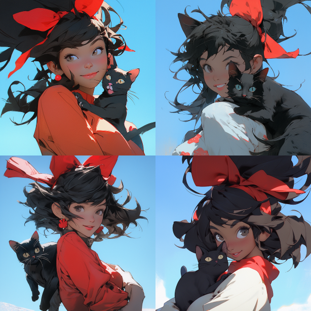 Midjourney Bot 更新时间:2023-08-28 17:52A girl, Asian face, black hair, big blue eyes, a big red bow on the head, blue sky background, a cat in arms, view from look right, high resolution, the best quality, 8k --s 163 --ar 1:1 --style expressive --niji 5