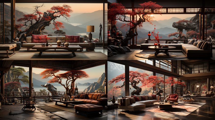 Midjourney Bot 更新时间:2023-08-28 17:50In this new Chinese style interior, you will be deeply attracted by the warm wooden furniture and ancient traditional art. When you enter the room, a beautiful landscape painting is displayed in front of you, depicting undulating mountains and flowing rivers with delicate strokes. The entire space exudes a peaceful and harmonious atmosphere, as if being in an ancient Zen temple. The red curtains were gently brushed by the wind, and the sunlight shining through the windows reflected the blue and white tiles on the ground, creating a charming interplay of light and shadow. The furnishings inside the house are carefully selected, including exquisitely carved screens, hanging calligraphy and paintings, and blue and white porcelain. The entire space blends traditional and modern elements, creating a unique and elegant atmosphere. Whether it's dining, reading, or leisure, this new Chinese style interior will bring a sense of tranquility and comfort to people. --s 866 --ar 16:9 --style raw --v 5.2