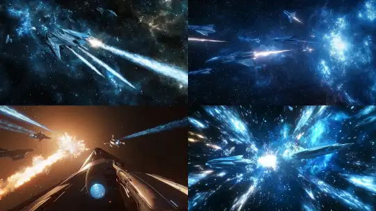 Midjourney Bot 更新时间:2025-01-06 00:11In first-person perspective, against the vast background of the universe, multiple fighter jets soar like untethered raptors, piercing through the tranquil void. They launch high-energy microwave pulses, energy waves striking enemy ships, causing explosions, while the engines of the aircraft emit dazzling blue flames, creating bright trails that resemble a brilliant meteor shower. Gunfire and light intertwine to form a stunning tableau of future warfare. --cref