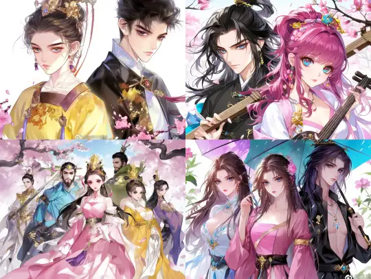 Midjourney Bot 更新时间:2025-01-06 00:22Women and men standing together, Wei Jin style clothing, exquisite facial features, gem like eyes, wide-angle lens, full body close-up lens, rich details, Hanfu, standing painting, ancient China, white drawn comics, flat illustrations, line drafts, animation style, watercolor style, high-resolution, 8k, pure white background, pink white, Chinese style, clear edge lines, a peach blossom decoration, --sref