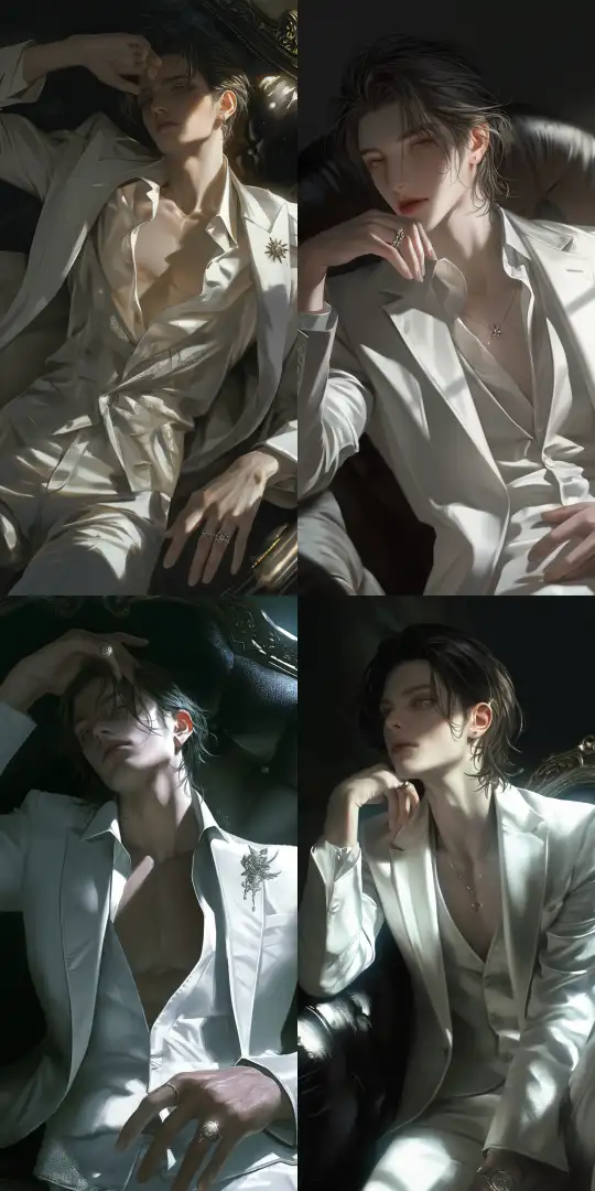 Midjourney Bot 更新时间:2025-01-05 00:08In a dim environment, a handsome man, heavily made up, half-length close-up, wearing a ring on his hand, dressed in a white suit, with his jacket partly open revealing his collarbone. He is looking up, resting his head on his hand, sitting high on the sofa, a beam of light shining on his face, adding to the mystery. His expression is arrogant and indifferent, with a daddy vibe, exquisite makeup, delicate and refined features, a handsome young man with slicked-back black hair, messy and fluffy, HD details, Japanese art, 8k, a mole under his eye, oil painting, two-dimensional style, masterpiece, highest image quality, messy hair, handsome, detailed strands, long eyelashes, highest image quality, translucent, delicately rendered with rich details, two-dimensional style, artistic conception, fluffy hair strands, thin lips, surrealism, exquisite details, refined face, high-end feel, matte, sickly sweet vibe, handsome young man, half-length close-up, dark background behind him, high-end CG. --niji 6 --ar 1:2 --style raw --s 150