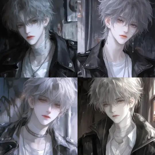 Midjourney Bot 更新时间:2025-01-05 00:09A man with blue gray hair and amber eyes, cold and aloof, wearing a black leather jacket and a white vest, with a metallic feel, earrings, a silver necklace, and a cool and handsome temperament. He is in a small alley with bandages on his face, showing some disdain. He is a drag brother during the day, with high-definition close-up, silver black tone, and facial close-up --niji 6 --ar 1:1 --s 360 --p kci3hd6