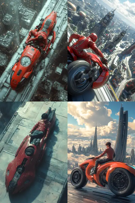Midjourney Bot 更新时间:2025-01-04 00:00eye level view, on a high platform of a futuristic city, a red Akira motorcycle is parked, a boy in a red leather jacket is lying on and riding the motorcycle, 3D rendering --v 6.1 --ar 2:3 --style raw --s 202 --c 20