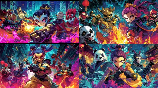 Midjourney Bot 更新时间:2025-01-04 00:01Design a visually striking, forward facing, and multi combat stance poster featuring multiple cartoon characters with Chinese characteristics. Set against the backdrop of Chengdu, China, the poster features bronze figures, people wearing Peking Opera masks, panda figures, red pandas, and Taoist priests. The poster also includes talismans, Chinese folding fans, lamb skewers, hotpot, high-rise buildings, and other characters that come together in a trendy Marvel Comics style --sref